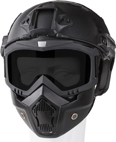 - โ High-quality materials: helmets and accessories are made of high-quality ABS. The foldable mask is made of low-carbon metal mesh and 1000D nylon. The tactical goggles frame is made of thermoplastic polyurethane and elastic rubber (TPU) and the lens is made of PC material.