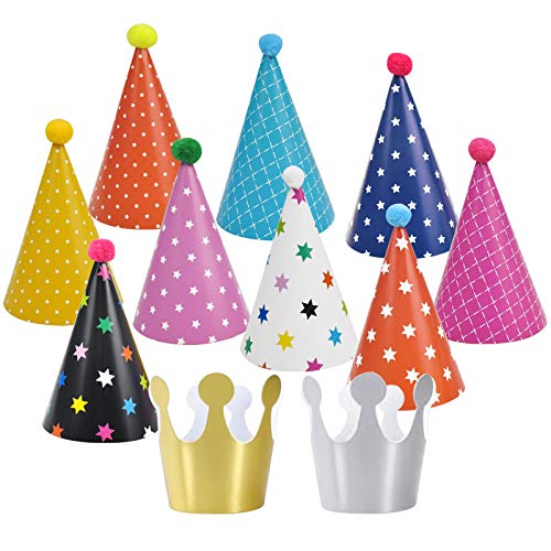 - VALUE 11PCS PARTY HAT: Our party hat set includes 9 pom-pom hats and 2 crown hats. The birthday hat is conical with colorful pompoms, and attached with an elastic cord and glue to help secure it.